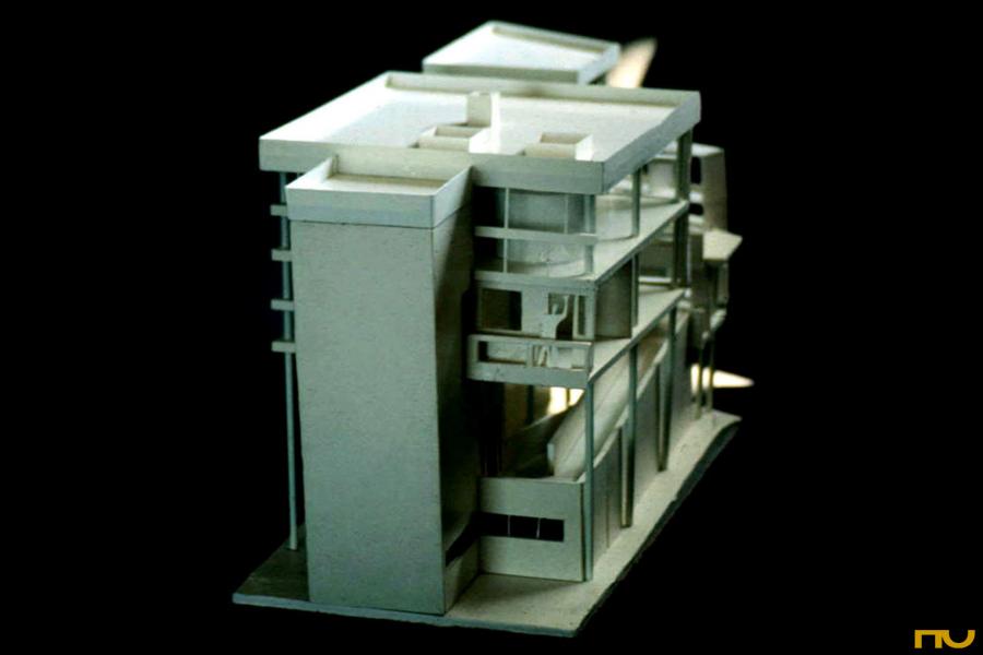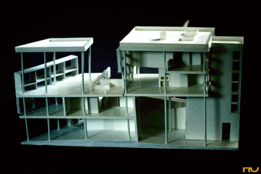 brise-soleil, housing between party walls, pilotis, promenade, ramp, terrace,