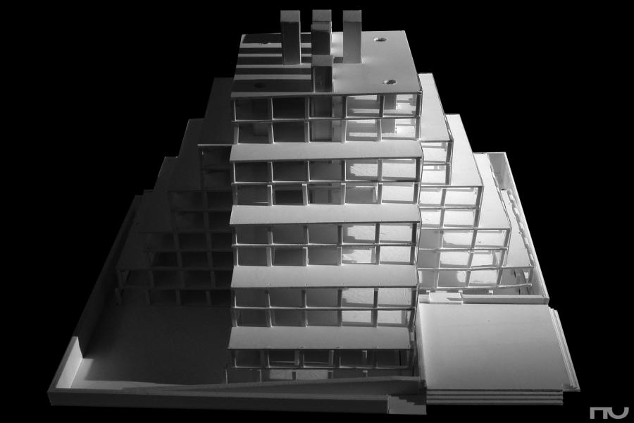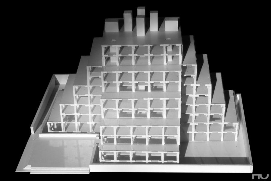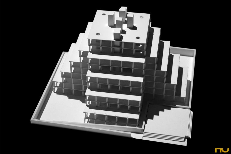 Kahn va proposar una planta en forma de creu que s’anava elevant per a definir una massa piramidal esglaonada, mentre les ales de les creus s’anaven fent cada cop més curtes. Això el portava a definir un mòdul quadrat de 5,25m de costat amb el que creava un entramat tridimensional que determinava la forma de l’estructura, dels espais i dels detalls que resolien els diferents episodis de l’edifici.