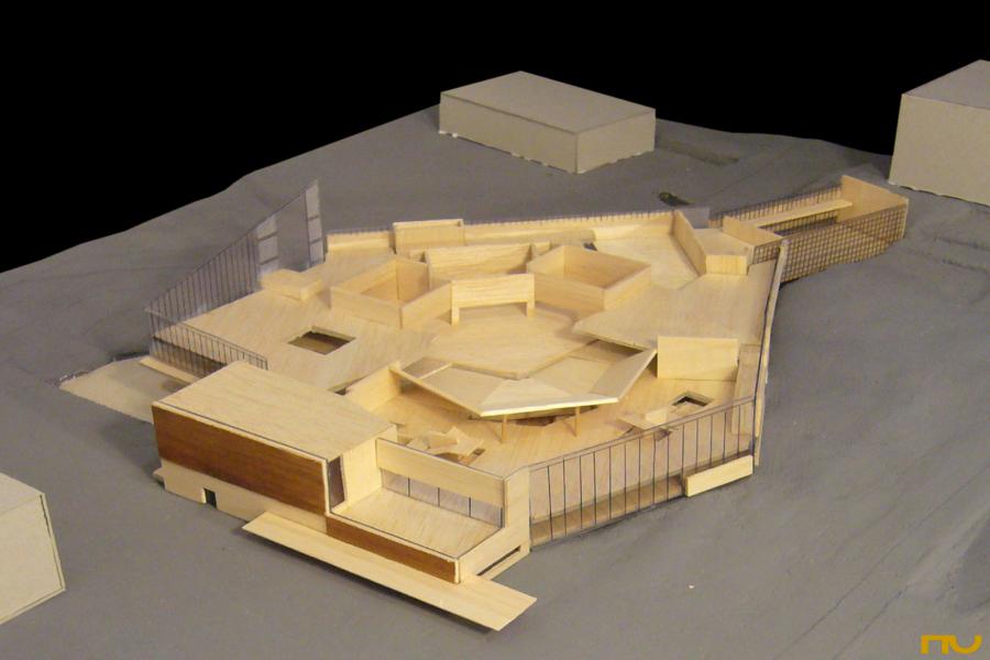 L’escenari partia d’un quadrat girat 45º respecte a l’alineació de la façana nord i al voltant del seu eix es disposaven els seients de l’auditori (1.100 espectadors) i els escenaris laterals, col·locant-se a la planta baixa dues safates de seients laterals perpendiculars als dos costats del prosceni i una central seguint l’eix nord-sud. A la planta alta les safates adquireixen un angle més acusat i la franja central una major amplada. A partir d’aquesta simetria es disposaven les quatre escales d’accés al vestíbul, al qual s’accedia a través de l’espai d’entrada connectat amb la Heimplatz, protegit per un voladiu. A través d’un accés paral·lel el visitant podia dirigir-se a un auditori secundari (176 espectadors) situat a la planta segona, mitjançant una escala de cargol. Al llarg d’aquests recorreguts, des dels vestíbuls, les terrasses, el bar o el restaurant, s’establien abundants contactes visuals amb la ciutat.