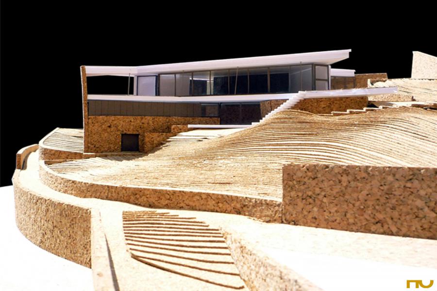Els espais de servei (safareig, cuina, magatzems, habitacions) es porten cap a l’interior de la planta, en contacte amb els murs de contenció ubicats a nord i il·luminats des de la perifèria o a través d’un pati triangular de generoses dimensions, que permet deixar als dormitoris i sala d’estar en les millors condicions de vistes i assoleig. Així, els murs principals s’estenen cap a la vista sud-est format una façana de 27m, completament vidriada, cap al mar.