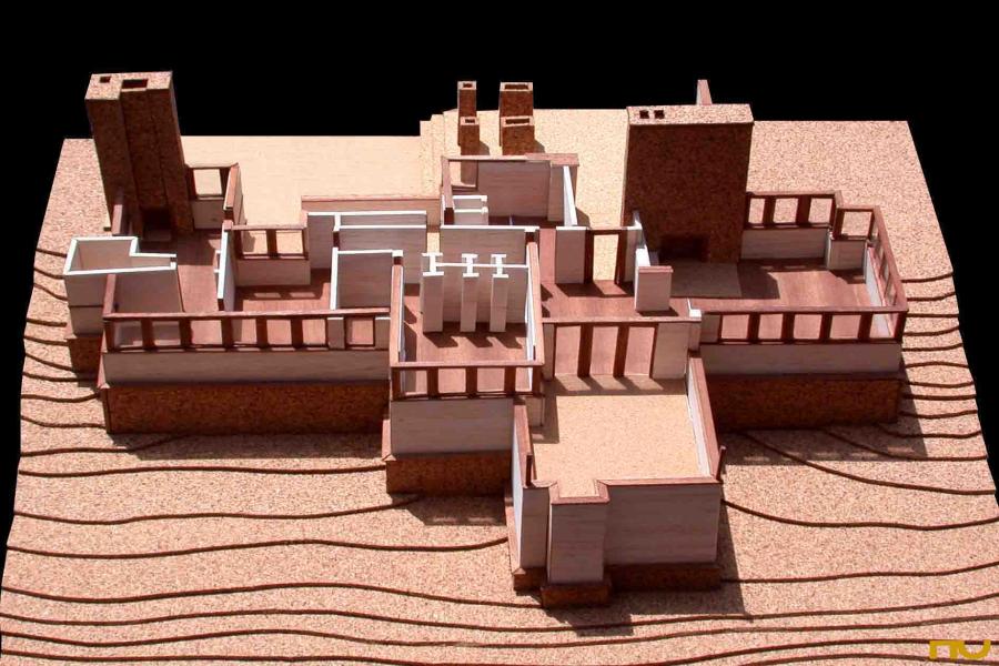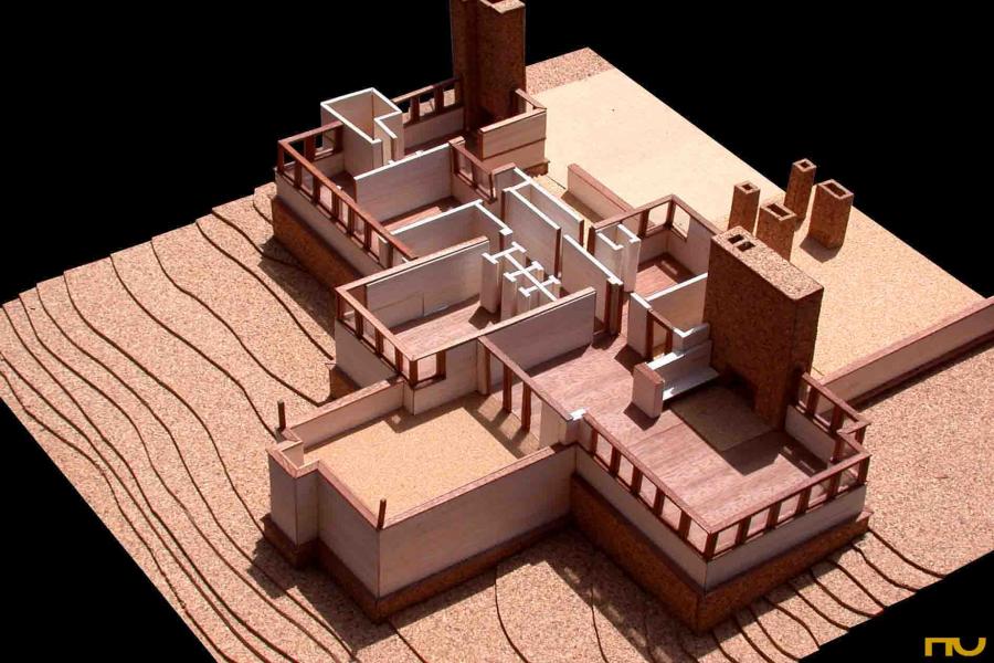 La planta de Tallesin I té forma d' "U" amb dos eixos principals i un altre secundari; en la seva intersecció trobem un espai d'accés cobert i amb quatre grans pilars que emmarquen el paisatge abans d'entrar a la casa, situada a la dreta o a l'estudi, a l'esquerra. La casa se orienta principalment cap al sud-est i sud-oest amb vistes a l'Helena Valley i contenia inicialment tres dormitoris, cuina i la sala d'estar. La sala d'estar, formada per moltes cavitats recollides sota el gran sostre, domina el conjunt. Les relacions entre els espais interiors mostren un tractament similar a les que mostren altres Prairie houses, amb visions diagonals i articulacions en torn a les xemeneies. Però, a diferència d'aquelles, els punt més altos no són les xemeneies -que, més aviat, es fusionen amb els murs- sinó la torre de la granja, situada cap al nor-oest, com un gran eix vertical de tot el conjunt. L'estudi està constituït per una sèrie de quatre habitacions -una gran i tres petites amb bandes altes que deixen passar la llum de nord, similars a les que es poden veure a l'Avery Coonley Playhouse (1911) o a la casa Avery Coonley (1908). Wright havia tornat del seu viatge per Europa (1909-1911) més convençut que mai que els edificis havien d'estar en harmonia amb el seu paisatge mitjançant un correcte emplaçament i una adequada elecció dels materials. Els murs i xemeneies son de una pedra calisa groguenca d'una cantera molt propera, tallades rústicament en peces allargades que donen la sensació de ser estrats naturals, les finestres de fusta es col·loquen com franges horitzontals, les cobertes de pissarra son baixes i amb dilatats voladissos, els exteriors son tractats mitjançant lloses, esglaons i estancs de pedra calisa alternats amb jardineres. Totes aquestes caracterÃstiques i el fet de que la casa no tingui una façana principal concreten la obsessió de Wright de que la casa aparegui com una perllongació de la pròpia naturalesa, allunyada de la vocació urbana o les simetries -tot i que a vegades amagades- de les Prairie houses. Tanmateix, Taliesin avança alguns dels temes de la seva arquitectura dels anys Vint i Trenta com els llargs passadissos, l'organització telescòpica dels espais, l'augment de la fluïdesa entre els espais interiors i exteriors. F.A. |
