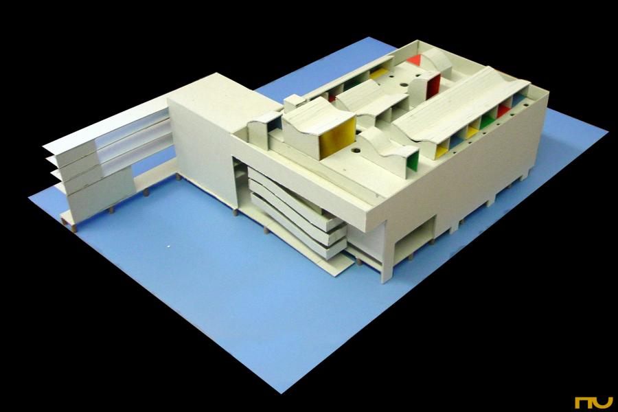 espiral quadrada, formigó, llum zenital, plataforma, promenade, edifici asistencial,