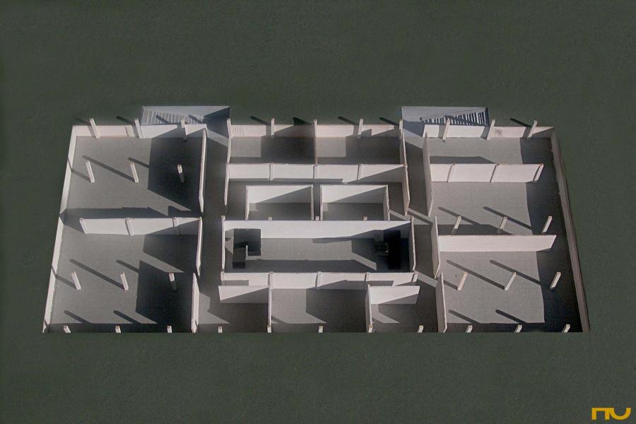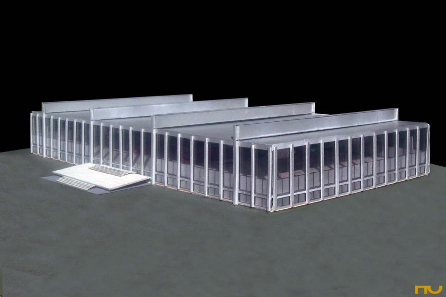 capsa, edifici docent, espai universal, plataforma, pòrtics exteriors, simetria,