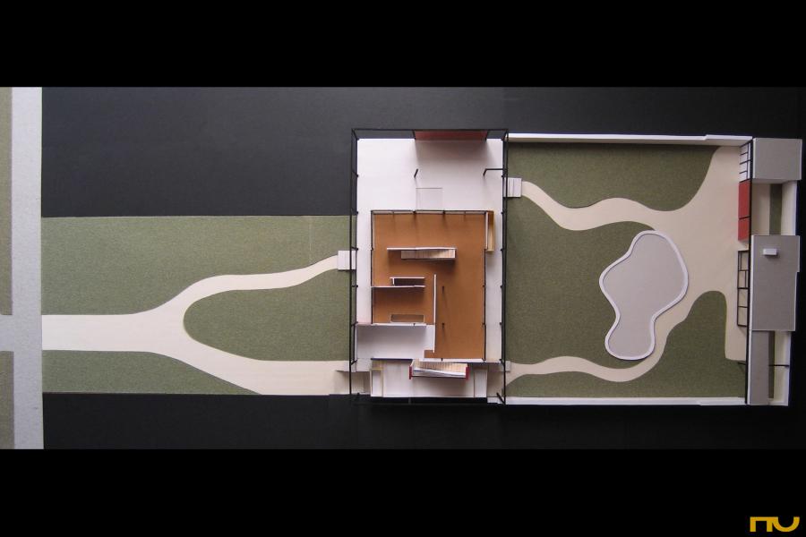 Early since the first designs, Bonet locates the rectangular plan of the house in the central and widest area of the lot, separating the parcel into a front access yard at the northwest and another one at the back, more private, with an existent pool facing southeast. The house program divides into day and night zones. The day zone consist of an entrance hall, the living room, a library, the music room, the children’s room and the dining room, all set up at the ground floor 70cm (2,3 ft) above the garden level. In the upper floor, the night zone holds bedrooms and bathrooms, destined both for family and service staff. In the southeast wing a stairway connects the service area at both floors, independent from the main staircase next to the entrance and the living room. A one-storey playhouse, including dressing rooms, closes the rear side of the lot, using equivalent plastic vocabulary of the house’s main volume.