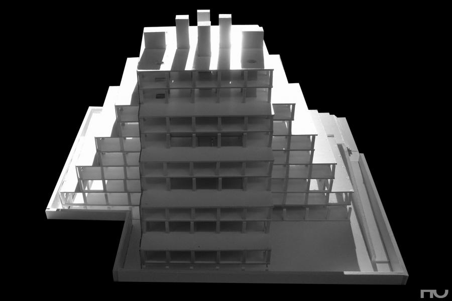 En una mirada rápida, este ejercicio se sitúa a caballo entre dos proyectos muy conocidos de Kahn: los Baños de Trenton (1955) y la Biblioteca Exeter(1966) aunque podemos encontrar más ejemplos en ese decenio, como el Martin Research Institute (1955-7). Más allá de esos vÃnculos basados en el uso del cuadrado, la pureza de la forma y la idea de monumentalidad, en el plano funcional este proyecto prefigura soluciones de organización de la planta y, en especial, de la sección, como es el caso de los dobles espacios situados en la periferia.
