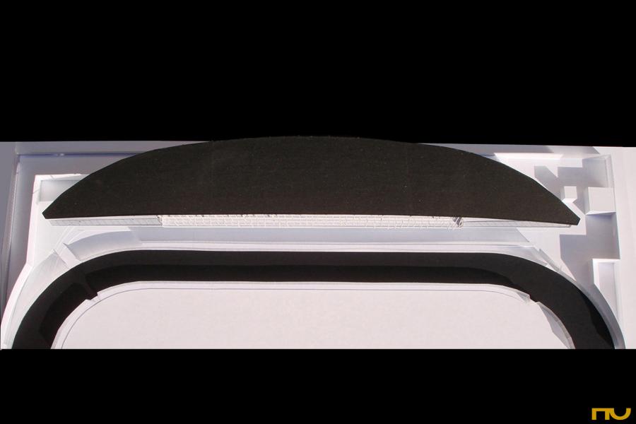 edifici esportiu, forma còncava, forma corba, horitzontalitat, muntatge, simetria, voladiu, volta, transparència, acer, repetició,