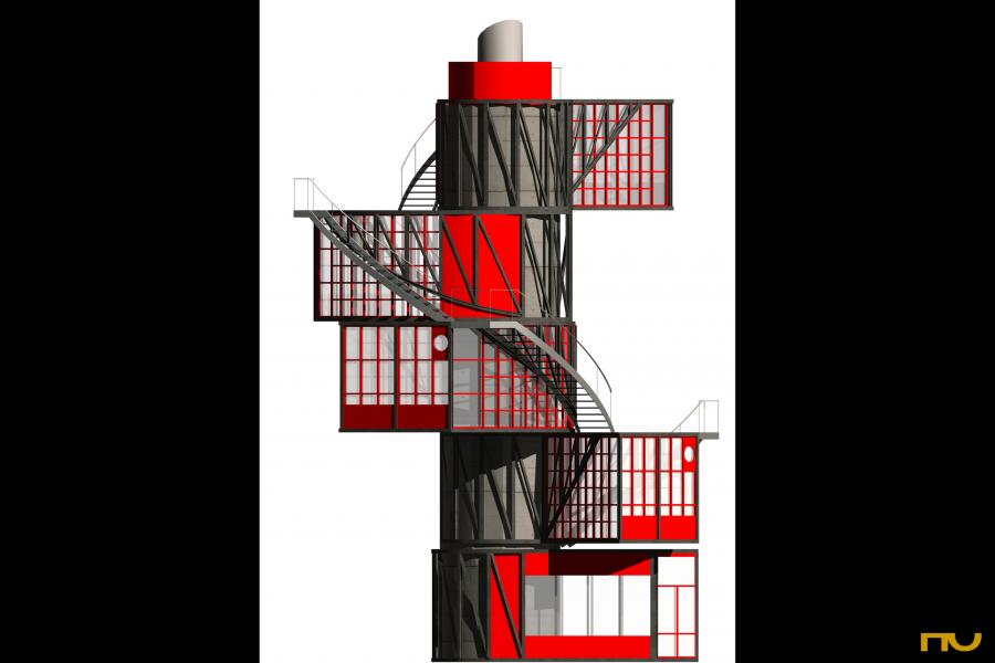 En 1924 se convocó un concurso para la construcción de una torre para el Leningrádskaya Pravda (La verdad de Leningrado–la actual San Petersburgo) en la capital de la Unión Soviética. El espacio disponible era mínimo: un cuadrado de 6 x 6 metros en la plaza Strásnaya (Strastnoy) –hoy Plaza Pushkin—ubicada sobre la traza del Boulevard Strastnoy, que limitaba el segundo y tercer anillo de Moscú, y junto a una de las calles radiales que conectaban con el Kremlin. La privilegiada ubicación de la torre es similar a la elegida por El Lissitsky para sus rascacielos horizontales y estructuras conmemorativas y revela la intención propagandística de esa ocupación de las principales plazas de la ciudad con manifestaciones del arte revolucionario. Por lo tanto, no sorprende el listado de arquitectos que se presentan al concurso: los hermanos Vesnin, Golosov, Guinsburg y el propio Melnikov, todos ellos miembros destacados de las filas constructivistas. Usando palabras del crítico formalista Víctor Sklovsky, habrá que ver, entonces, “la disimilitud de lo similar” para destacar los valores de este proyecto entre esos otros, todos ellos dispuestos a expresar los símbolos revolucionarios, el ritmo nuevo de la ciudad, el clamor modernizador. El proyecto de Melnikov partía de un núcleo cilíndrico de hormigón que alojaba una caja de escaleras de caracol y un ascensor. En torno a ese núcleo rotaban cuatro módulos de acero y vidrio, suspendidos en voladizo mediante unas guías y perfiles metálicos, una idea que repetirá en los croquis realizados para el concurso del Pabellón de París de 1925. Su propuesta parecía mezclar ideas presentes también en la propuesta de los hermanos Vesnin—ganadores del concurso—y de Golosov, como la incorporación del movimiento –el tiempo—como un material nuevo para la arquitectura, los efectos de la transparencia o el hormigón armado. Pero mientras los Vesnin promovían la visión del movimiento vertical del ascensor o la del cartel en la coronación de la torre, Melnikov parecía más interesado en buscar la mayor variedad de posiciones de esos módulos móviles y , consecuentemente, la infinita riqueza de efectos y de luz en todo el edificio. Y si bien utilizaba una estructura de hormigón como Golosov, mientras que este modelaba el material forzándole a adoptar complicadas formas estrelladas o cilíndricas, Melnikov lo interpretaba como un núcleo encastado en el terreno para compensar el esfuerzo al que la estructura sería sometida por la rotación de los forjados. A partir de aquí, la comprensión técnica del funcionamiento del edificio se hace compleja. Los materiales dejados por Melnikov sólo permiten especular sobre la forma y el funcionamiento de sus elementos básicos: los soportes inferiores en voladizo y la forma de cada módulo. El modelo y dibujos que aquí se muestran se basa en una lectura atenta del proyecto y de sus interpretaciones más destacadas (la de O. Mácel-R. Nottrot y la de E.Steiner). Podemos comprobar en ellos aspectos complementarios como la forma trapezoidal del módulo(con un lado recto y uno curvo), y las articulaciones entre las terrazas y escaleras exteriores. (F.A.P.) |