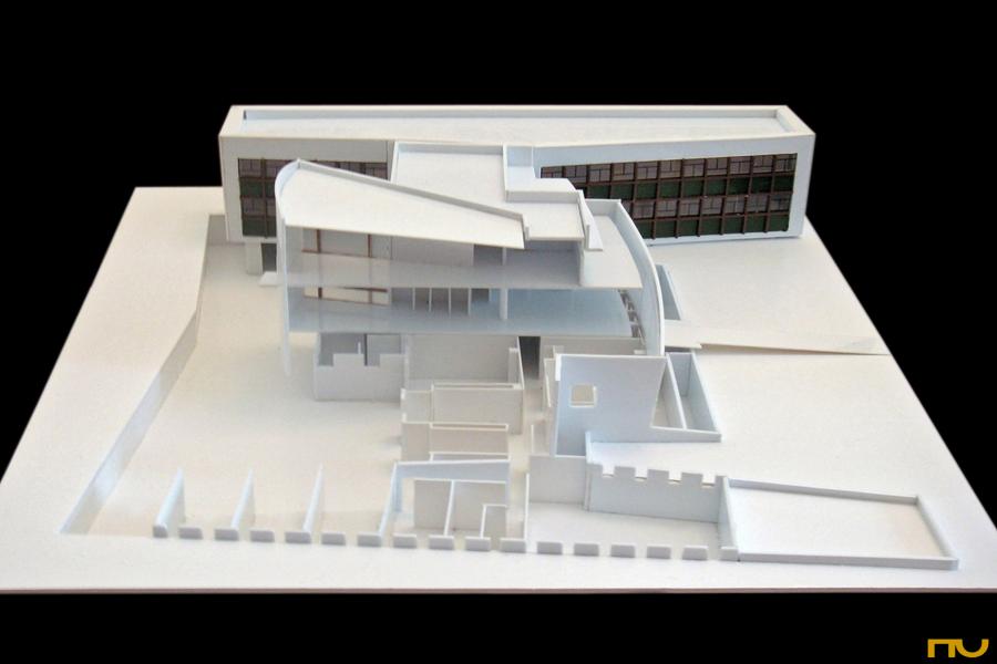 El programa se organiza en tres partes diferenciadas funcionalmente, que corresponden a sendos niveles: el área de servicios en el subterráneo, la clínica en la planta baja, y el área de oficinas en la segunda. Las circulaciones y salas de espera discurren separadas del espacio de atención y su sección se ahúsa en proporción al flujo de movimientos y determina la ruptura de la ortogonalidad de la planta de cada una de las alas. El esquema de planta libre es consistente con la modulación estructural y los recorridos de las instalaciones que, ocultas en los antepechos de las ventanas y en los cielorrasos, son fácilmente accesibles mediante paneles móviles y dispositivos al efecto.