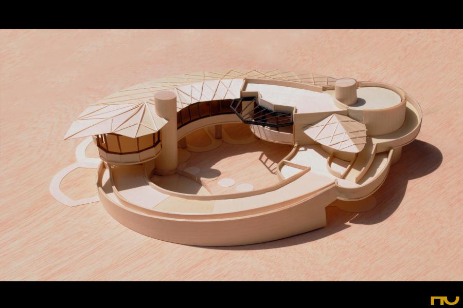 La consideración de los recorridos solares y el aprovechamiento o protección de las brisas dominantes son rasgos fundamentales del proyecto. La casa se eleva sobre un medio anillo circular apoyada sobre pilastras y vinculada al terreno con una rampa espiral que cierra el jardín central. Superado el acceso y ganada la horizontal, el movimiento circular continúa en la secuencia sala de estar y zona de dormitorios para acabar en la terraza. Al levantarse, la casa genera un jardín sombreado y ventilado que permite refrescar el ambiente y generar una ligera y deseada brisa. La propia rampa, de 7,60 metros de ancho, incorpora un jardín que la acompaña hasta el acceso.