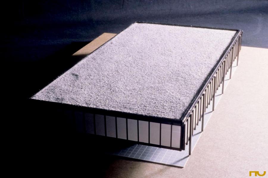 capsa, edifici d'oficines, pilar, plataforma, pòrtics exteriors, simetria,