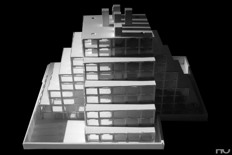 Kahn va proposar una planta en forma de creu que s’anava elevant per a definir una massa piramidal esglaonada, mentre les ales de les creus s’anaven fent cada cop més curtes. Això el portava a definir un mòdul quadrat de 5,25m de costat amb el que creava un entramat tridimensional que determinava la forma de l’estructura, dels espais i dels detalls que resolien els diferents episodis de l’edifici.