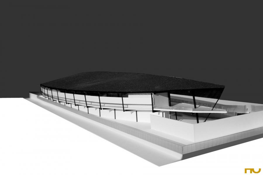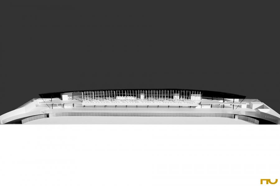 edifici esportiu, forma còncava, forma corba, horitzontalitat, muntatge, simetria, voladiu, volta, transparència, acer, repetició,