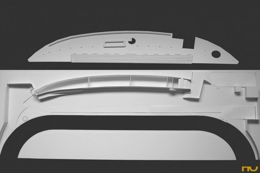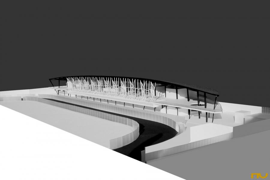 La forma general de l’edifici està fortament condicionada per la solució estructural que determina la presència de tres figures surants: la làmina parabòlica de la coberta, l’estriat vertical dels brise-soleils, i el conjunt de graderies i terrassa. La làmina de la coberta és una forma reglada portada a terme pel desplaçament d’una recta entre dues línies directrius: una parabòlica en planta i horitzontal en alçat (sobre la façana exterior de l’edifici, cap el carrer Riera d’Horta) i una altra de parabòlica en alçat i recta en planta (la façana interior). Aquestes dues línies, de diferent llargària (107m sobre la recta paral·lela a la pista), es divideixen en parts iguals, que unides defineixen les alineacions de les crugies. Seguint aquests trajectes radials es distribueix l’estructura principal, composta per 18 bigues metàl•liques de cantell i longitud variable inclinades cap el carrer segons el mateix angle i recolzades sobre una única línia de pilars a la zona central de la planta.
