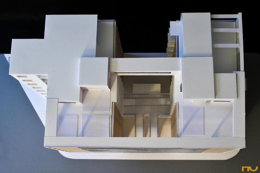 El acceso principal se produce axialmente desde Corso Sempione, a través de unas escalinatas que conducen al rellano que conecta los núcleos de circulación vertical de los dos bloques. En el basamento resultante se ubican los locales de servicio y un aparcamiento accesible desde dos rampas. Las cinco plantas tipo que conforman el fuste del edificio tienen la misma distribución –con la excepción de los espacios que aporta el bloque del lado norte- y están divididas en dos unidades por rellano. El último piso, reservado originalmente al propietario del edificio, se construye como una unidad independiente, como una villa separada de todas las fachadas y rodeada de terrazas y jardines. El área social se coloca sobre el cuerpo norte, y sobre el cuerpo sur se sitúa la zona de los dormitorios, quedando ambas conectadas por un puente que cruza el patio a 25 metros de altura.