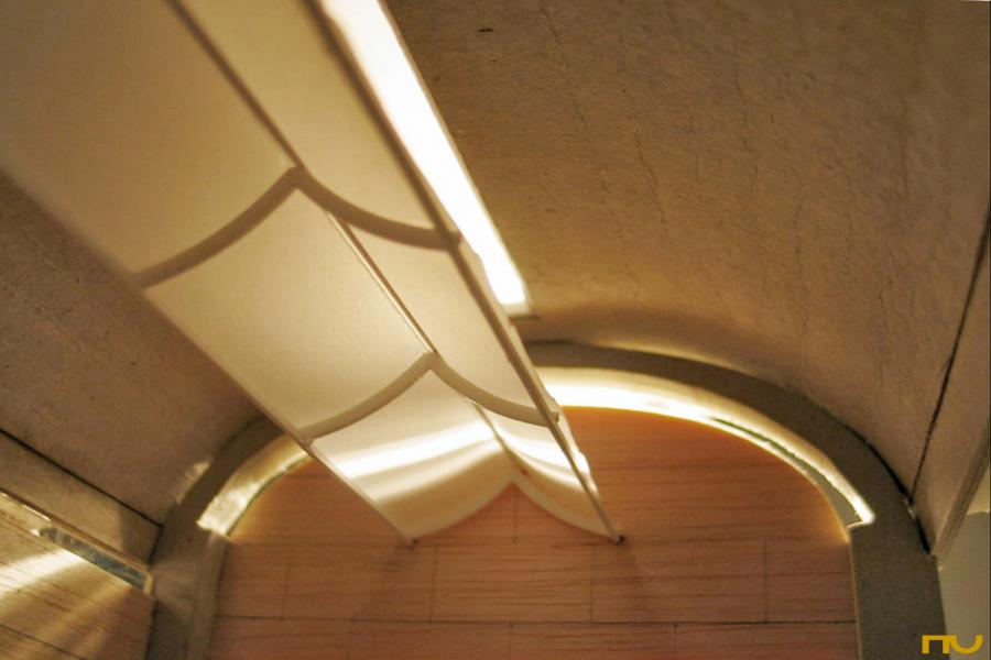 Des del punt de vista geomètric la secció de les voltes respon a la forma d’una corba cicloide amb un tall al centre que deixa passar la llum zenital. Això fa que des del punt de vista estructural la volta no treballi com a tal si no com dues bigues longitudinals de secció corba pretensades i recolzades a les columnes dels extrems, una solució sofisticada resolta per August Komendant, l’enginyer que va col·laborar amb Kahn en quasi totes les seves obres memorables.