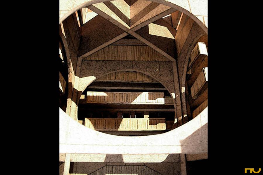 La Biblioteca -el projecte ideal per a un arquitecte, segons Boullée- és més rígidament clàssica que els seus treballs anteriors: una planta quadrada dividida en nou quadrats menors, amb un quadrat lliure al centre, o un gran cub (34 x 34 x 24) amb un cub central buit, o tornant a Boullée, un buit esfèric. No hi ha majors canvis en les tres versions que Kahn desenvolupa entre 1966 i 1968: la primera fins a octubre 1966, la segona fins a Juliol 1967 i la tercera, fins i tot noviembre1968. El primer lliurament mostra un edifici dividit en tres parts inscrites en una planta quadrada: una zona interior de formigó de tres altures rematada per un sostre piramidal, una zona intermèdia amb mezzanines per a l'emmagatzemament de llibres on predomina la fusta i una zona exterior contenint espais de treball i lectura, expressada per una façana de maons. Aquesta morfologia estructural, encarregada de diferenciar la forma i l'ús dels espais es manté invariable al llarg de les tres etapes esmentades.