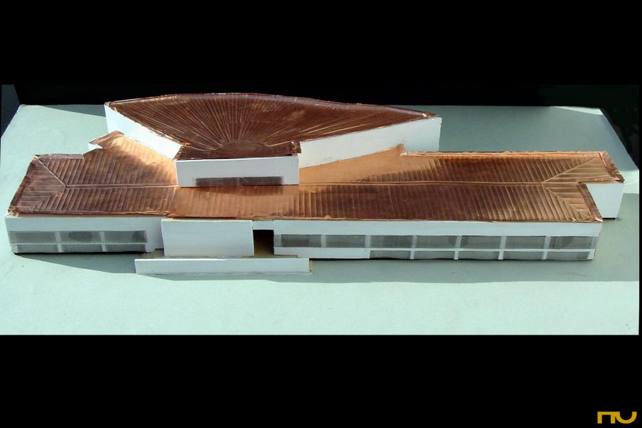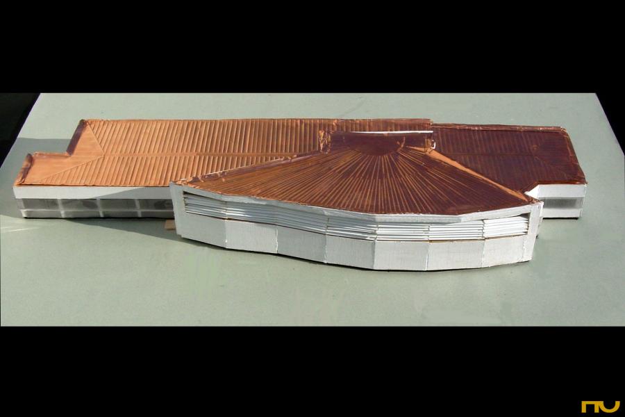 biblioteca, doble pell, forma corba, llum zenital, polaritat, textura,